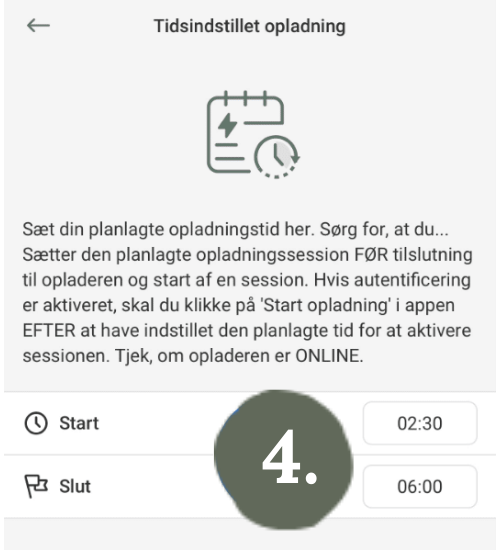 Hvis du har aktiveret denne funktion, skal du starte din ladesession med appen eller ladebrikken. Opladningen starter først i det valgte tidsrum.