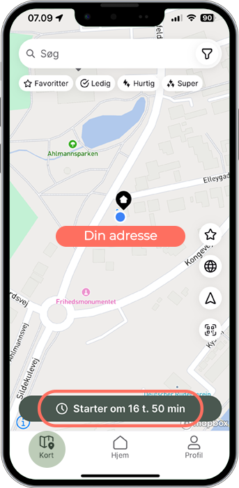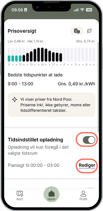 Under menupunktet hjem planlægger du opladning med tidsindstilling, du kan også se du hvor det er billigst at lade i dag.