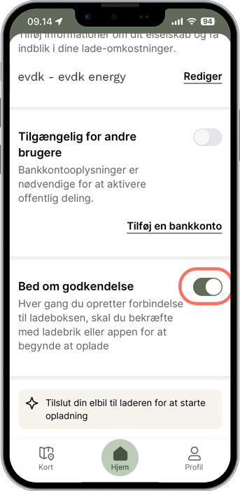 Er der lavet en tidsindstilling eller er “Bed om godkendelse” slået til under “Hjem” skal opladningen aktiveres ved at trykke på knappen: