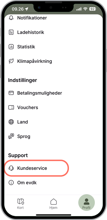 Under profil i evdk-appen har du mulighed for at tilgå ladehistorik, betalingsmuligheder, support og meget andet.