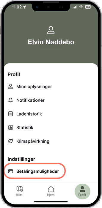 Tilføj din ladebrik og kreditkort under Betalingsmuligheder for at kunne lade uden for hjemmet.